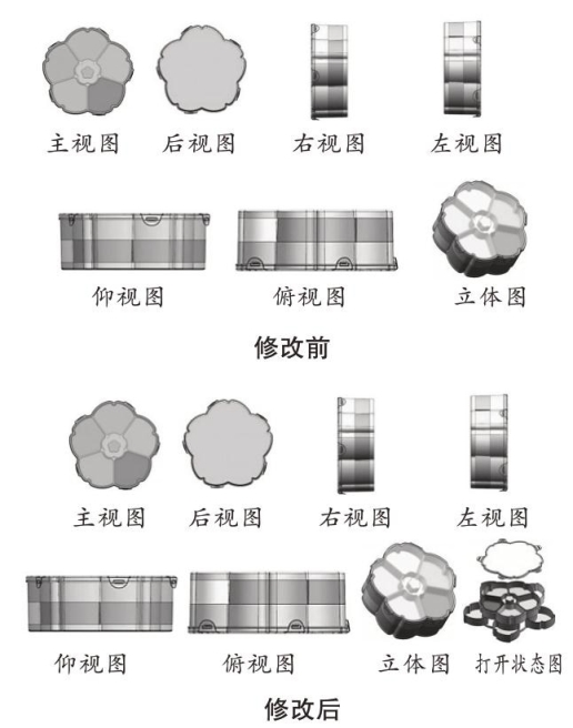 (1)增加原图片或者照片中未表示的图片。如图1所示“零食盒”的外观设计视图,修改后增加了产品打开状态图的设计内容。该设计内容显示了申请日图片中未表示的零食盒下层收纳格的内部形状结构,且根据申请日的正投影视图及立体图不能直接地、毫无疑义地确定,超出了原图片或者照片的表示范围。