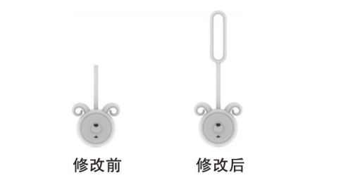 (3)增加原图片或者照片中未完整表示的设计内容。如图4所示“驱蚊挂件”的外观设计视图,申请日提交的视图中产品上部的结构未完整表示,修改后重新提交了内容完整的视图,产品上部的环状结构根据原申请文件并不能直接地、毫无疑义地确定,明显超出了原图片或者照片的表示范围。