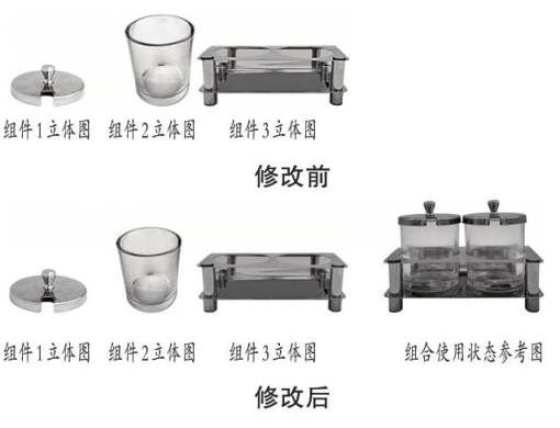 (5)增加原图片或者照片中已经表示的设计内容。如图7所示“调料罐”的外观设计视图,修改后增加了产品组合使用状态参考图。虽然该组合使用状态参考图在申请日的视图中未提交,但组件1、组件2和组件3的形状结构比较明确,组合状态下的设计内容可根据申请日的图片或者照片直接地、毫无疑义地确定,因此不属于超范围的修改。