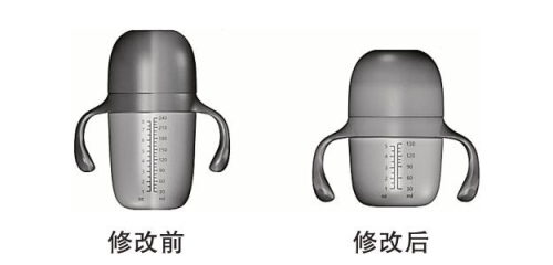 (1)改变设计要素。如图8所示“奶瓶”的外观设计视图,修改后改变了产品长宽高的比例关系以及表面刻度图案。虽然产品的结构并未改变,长宽高比例的变化属于产品领域内的常见设计,但修改后产品的整体形状及表面图案发生了变化,且根据申请日的图片或者照片不能直接地、毫无疑义地确定,因此属于超范围的修改。