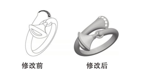 (2)改变视图形式。如图12所示“戒指”的外观设计视图,将申请日的照片视图修改为绘制视图,产品上部结构线、左侧外轮廓的形状以及色彩等多处发生了改变,修改后的外观设计与申请日的外观设计明显不同,超出了原图片或者照片表示的范围。