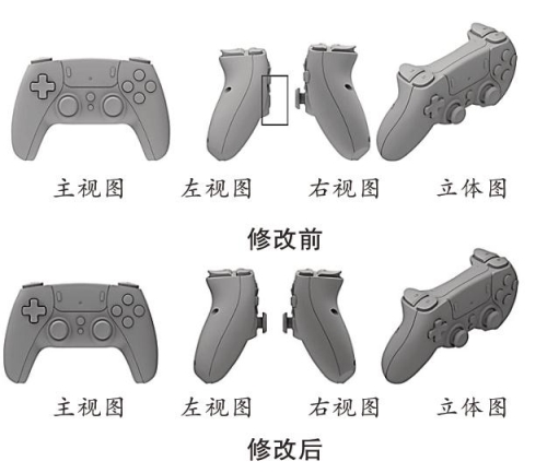 (3)克服缺陷的修改。如图14所示“游戏控制器”的外观设计视图,申请日提交的左视图中产品左侧未表示操控杆的形状结构,与其他正投影视图的投影关系不对应,与立体图表达不一致。修改后重新提交了带有操控杆结构的左视图,该修改内容在申请日的立体图中已经表示,因此不属于超范围的修改。