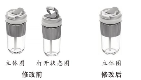 (1)因删除图片或者照片而减少设计内容的。如图15所示“水杯”的外观设计视图,修改后删除了打开状态图。水杯的杯口属于常见部位,该设计内容在其他正投影视图及立体图中并未表示,且不能直接地、毫无疑义地确定,删除后属于超范围的减少,不符合专利法第三十三条的规定。